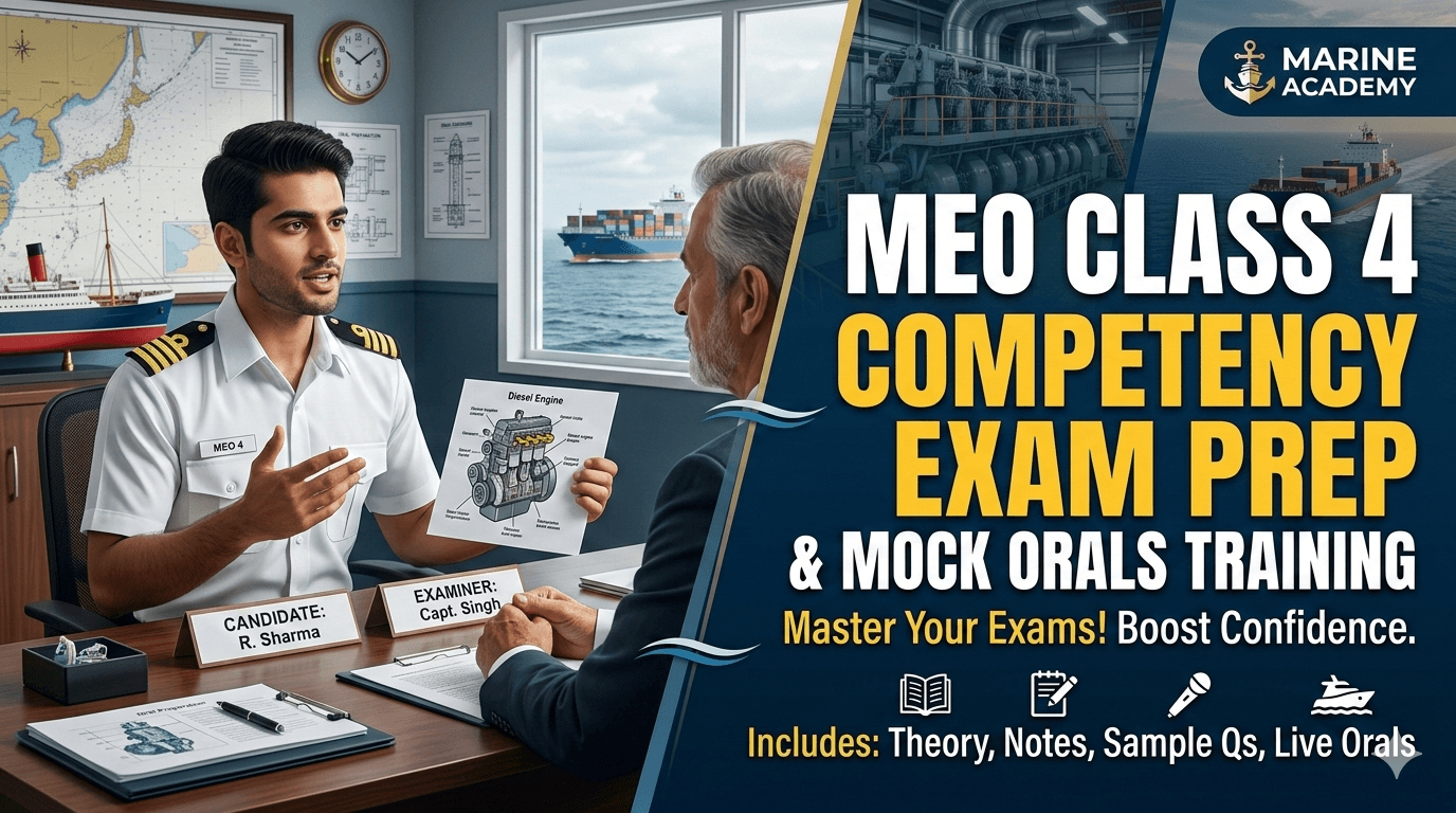 Comprehensive preparation program for MEO Class 4 competency exams including technical theory review, oral exam practice, and real interview simulations with experienced marine engineers.